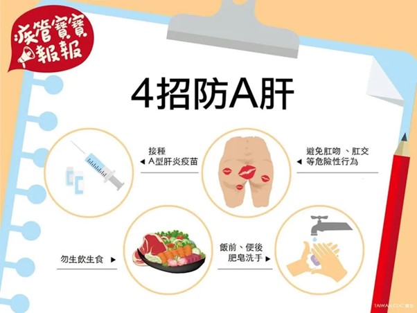 - 接種疫苗為最有效的預防措施,A型肝炎疫苗的安全性及效益很高,一般接種兩劑疫苗(間隔6-12個月),免疫力可維持20年以上。