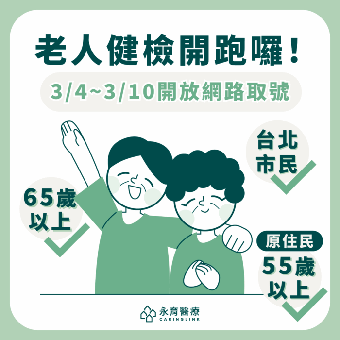 健康諮詢、早餐、尿液檢查、憂鬱症篩檢、失智症篩檢、糞便潛血檢查(50-75兩年1次,76歲以上每年1次)、視力檢查、身高、體重、血壓